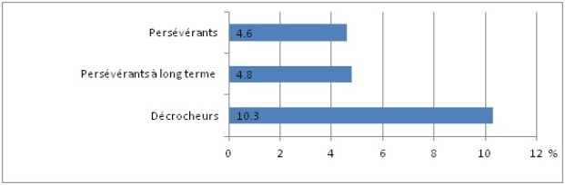 En 2009, 4,6 % des persévérants, 4,8 % des persévérants à long terme et 10,3 % des décrocheurs habitaient une province autre que celle d’inscription
